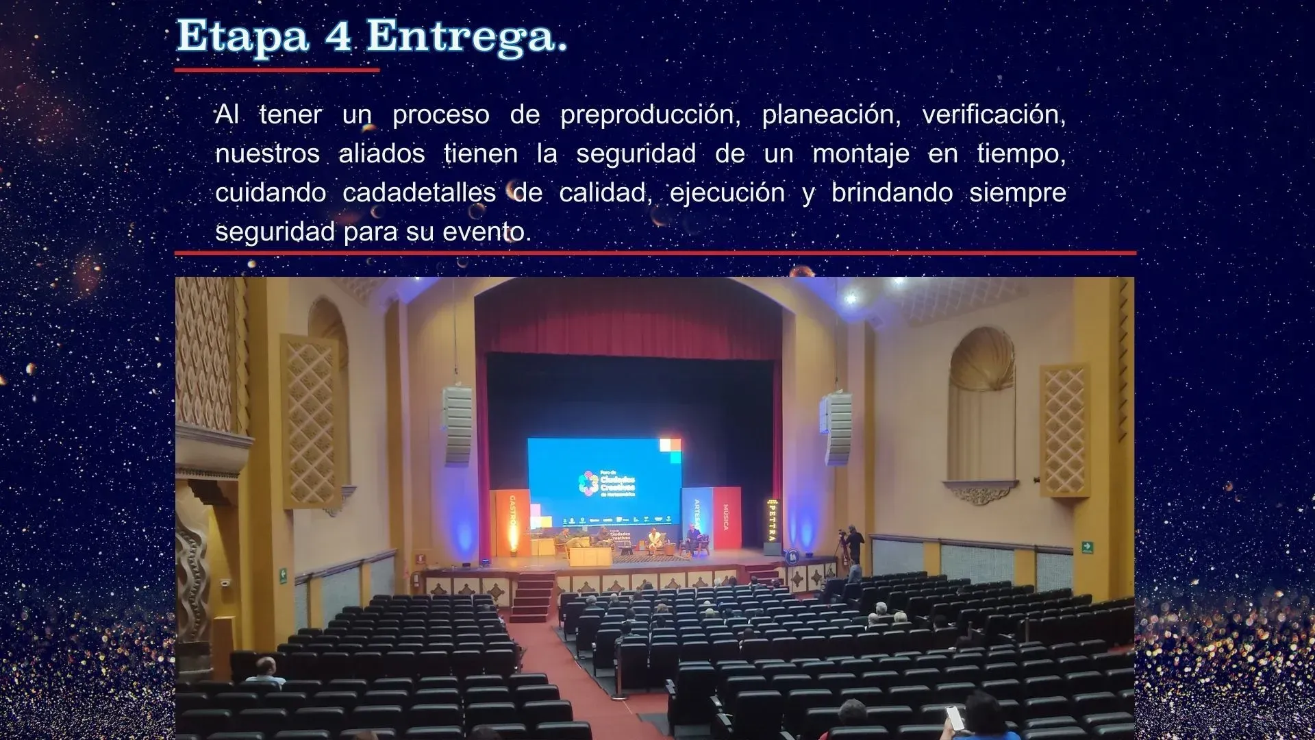 La iluminación adecuada, el sonido envolvente y los videos impactantes son esenciales para cualquier evento exitoso. Nos encargamos de la producción audiovisual para que todo fluya sin problemas.